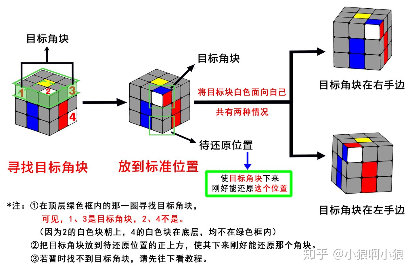 注意:形成倒“T”形的关键是看最终“目标角块”有没有在“待还原位置”。很多人白色底面确实也还原了,但是就没有出现倒“T”形,这是因为“目标角块”跑到了别的位置。所以这步一开始就要求“目标角块”一定要在“待还原位置”正上方,才能继续做公式