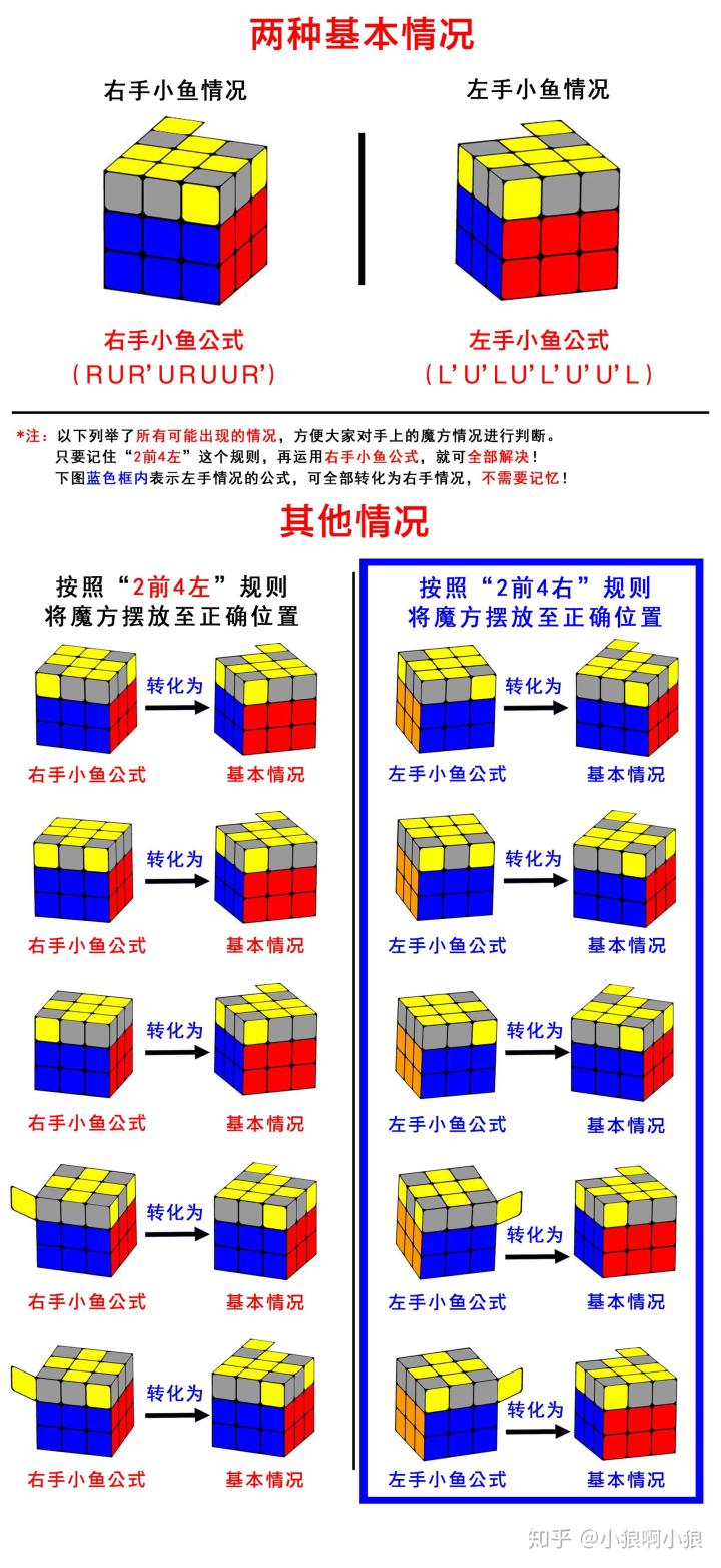 这两个小鱼公式是继两个基本公式以来第二重要的公式(因为最后一步也会用到),也是一对左右手的镜像公式,比基本公式复杂一点点,不是特别难记,一定要熟练掌握。