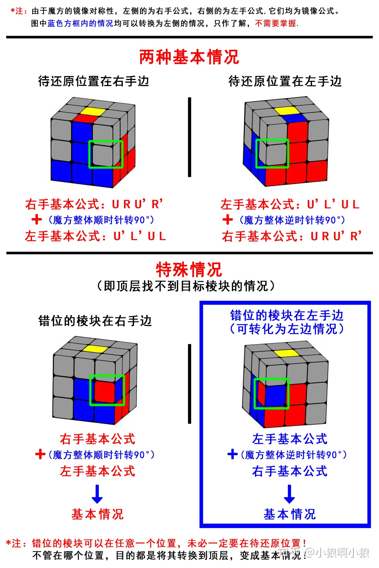 PS:最后一步其实还有更简便的方法:不用判断顺逆时针,只要看到“清一色”边就做“右手小鱼公式+左手小鱼公式”(没有“清一色边”就随机做),最多循环三次,即可复原。只是不用判断的方法略显繁琐一点。