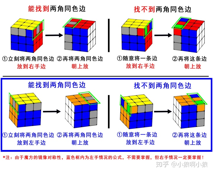 还原顶角这一步首先要找到“两角同色边”,如果暂时找不到,请先继续往下看教程。